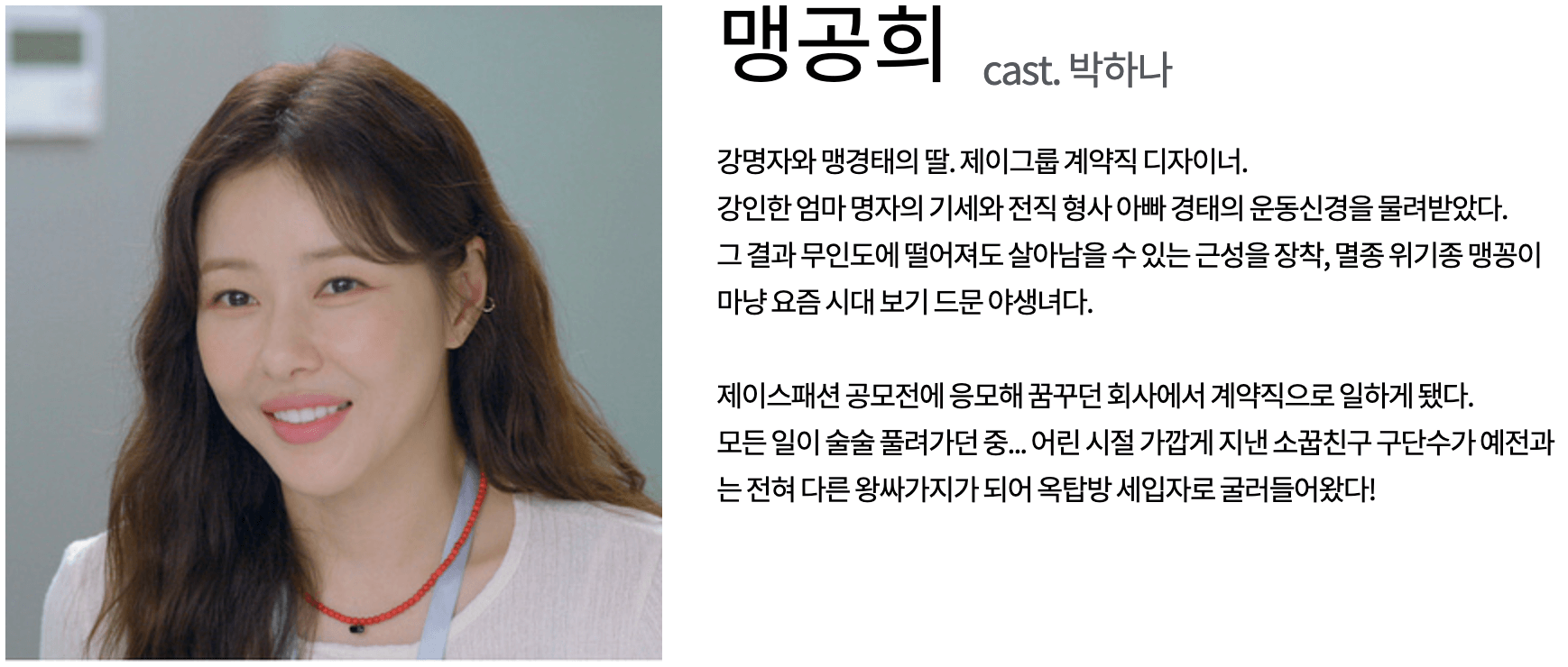 - 맹공희 (박하나): 제이 그룹의 계약직 디자이너로, 맹경태와 강명자의 딸입니다. 그녀는 자신의 꿈을 이루기 위해 노력하는 인물로, 여러 갈등을 겪으며 성장해 나갑니다.