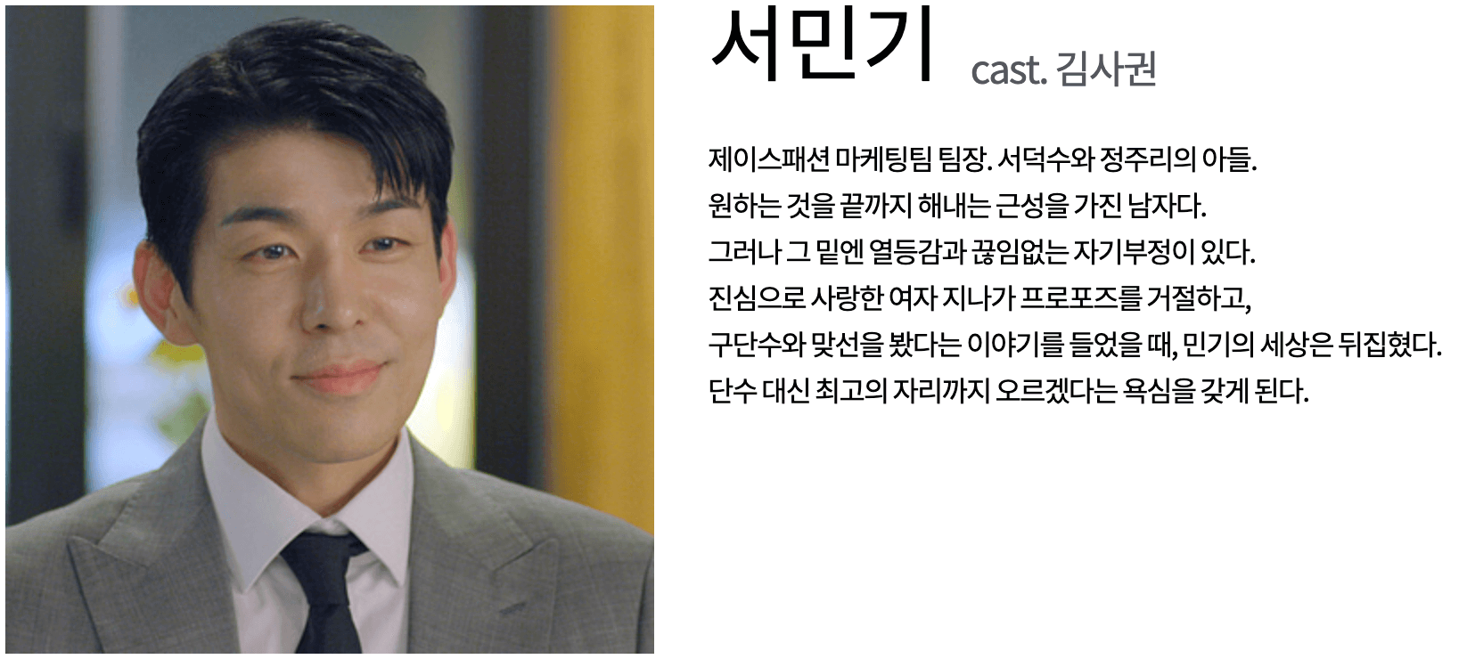 - 서민기 (김사권): 제이스패션 마케팅 팀장으로 서덕수와 정주리의 아들이며 최고의 근성을 가진남자이다.