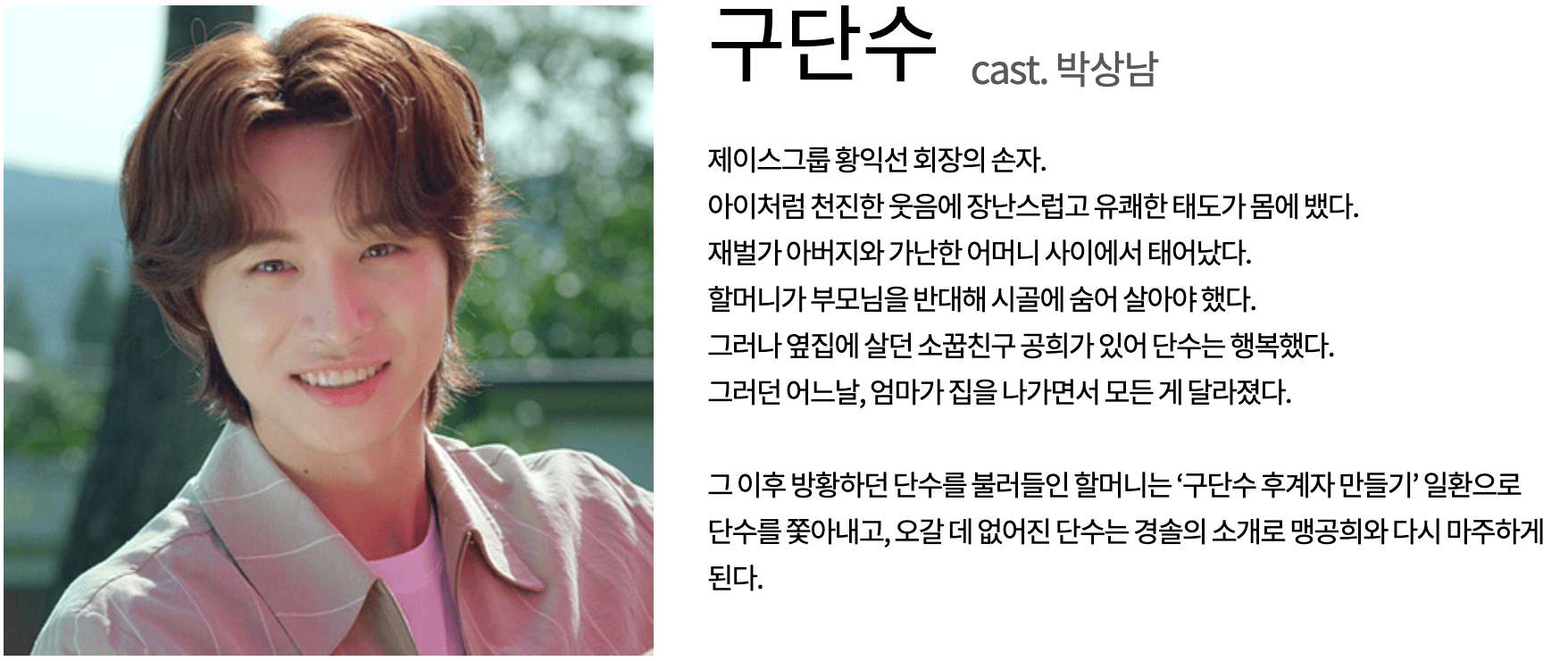 - 구단수 (박상남): 맹공희의 사랑을 받는 남자 주인공으로, 그의 진정한 사랑을 찾기 위한 여정을 그립니다. 그는 과거의 상처를 극복하고 새로운 사랑을 찾으려 합니다.