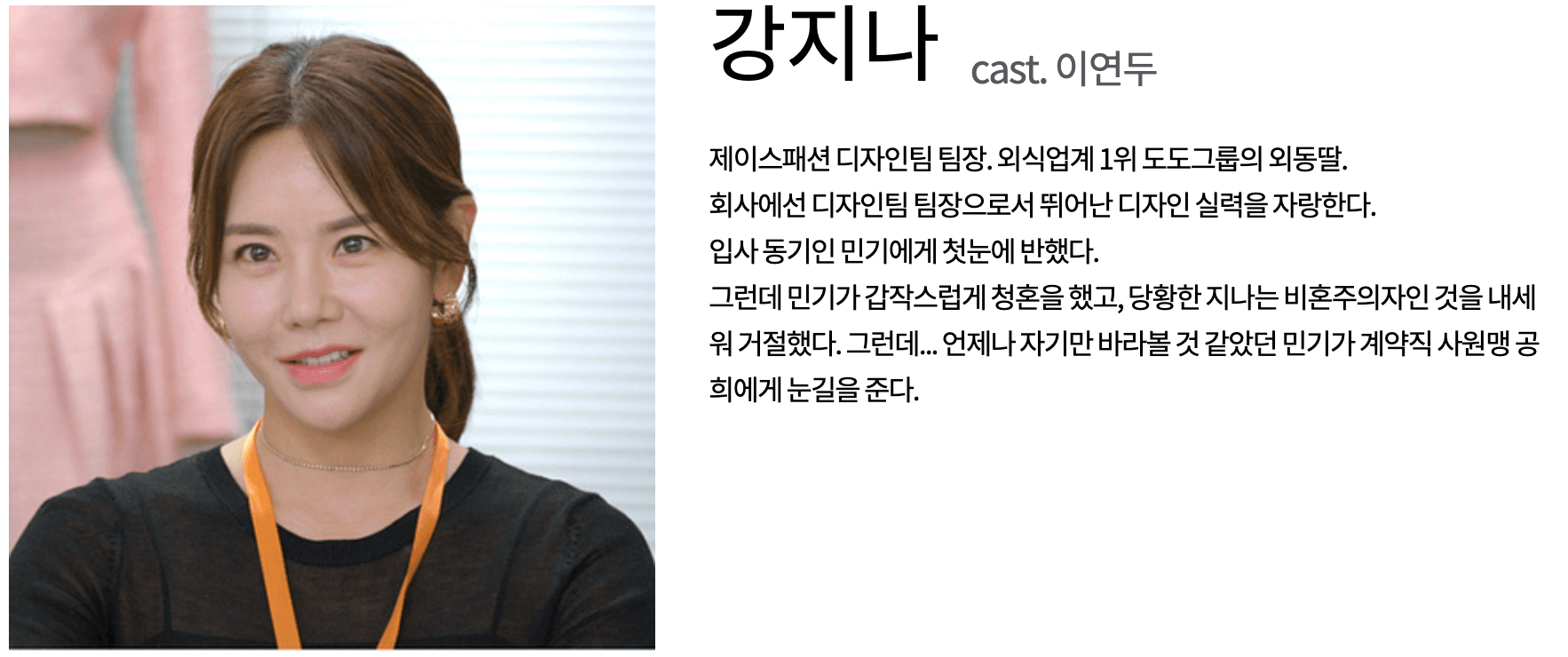 - 강지나 (이연두): 제이스패션 디자인팀 팀장. 외식업계 1위 도도그룹의 외동딸로 뛰어난 디자인 실력을 자랑한다.