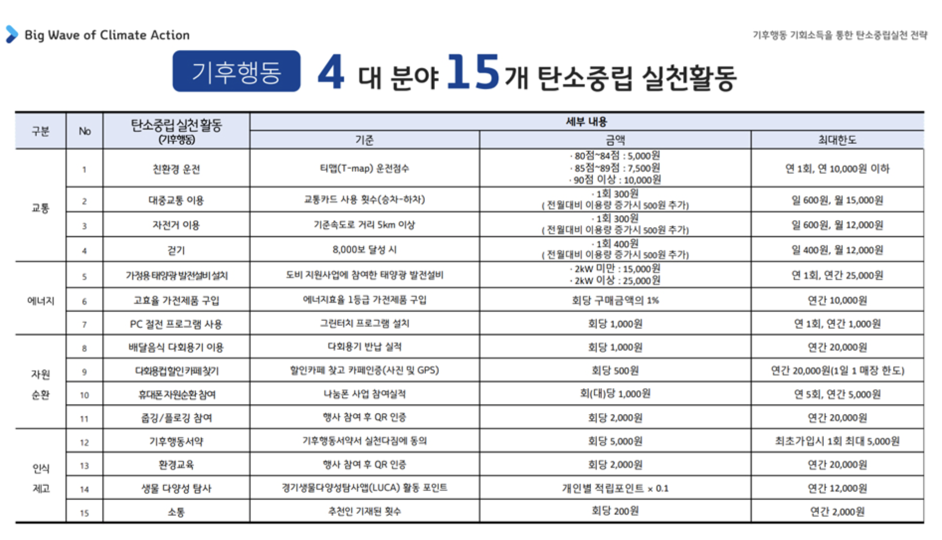 ▷ 기후행동은 4개 분야 15개 실천항목으로 구성되있으며, 도민 10만명 대상 1인당 연간 최대 6만원 한도 리워드 를 지급합니다.