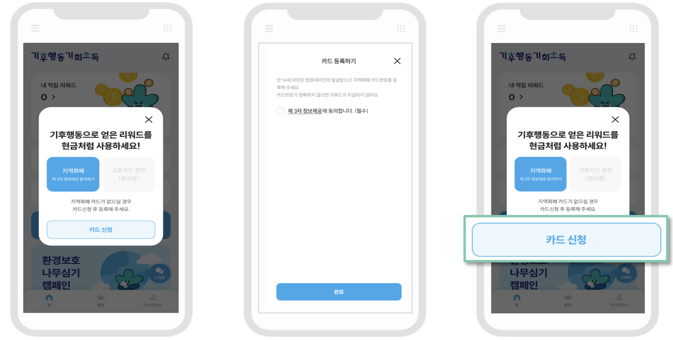 - 구글플레이/앱스토어에서 기후행동기회소득 검색 및 설치