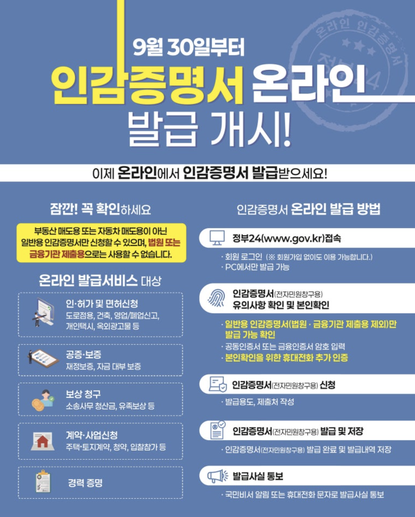 2024년 9월 30일(월) 9시부터 정부24 누리집(www.gov.kr)에서 일반용 인감증명서 발급 서비스를 발급 받을수 있도록 시범 운영한다고 합니다. 이제 인감증명서는 주민센터 방문 없이 PC를 통해 정부 24에서 발급 받으시면 되니 그 방법에 대해 자세히 알아보겠습니다.