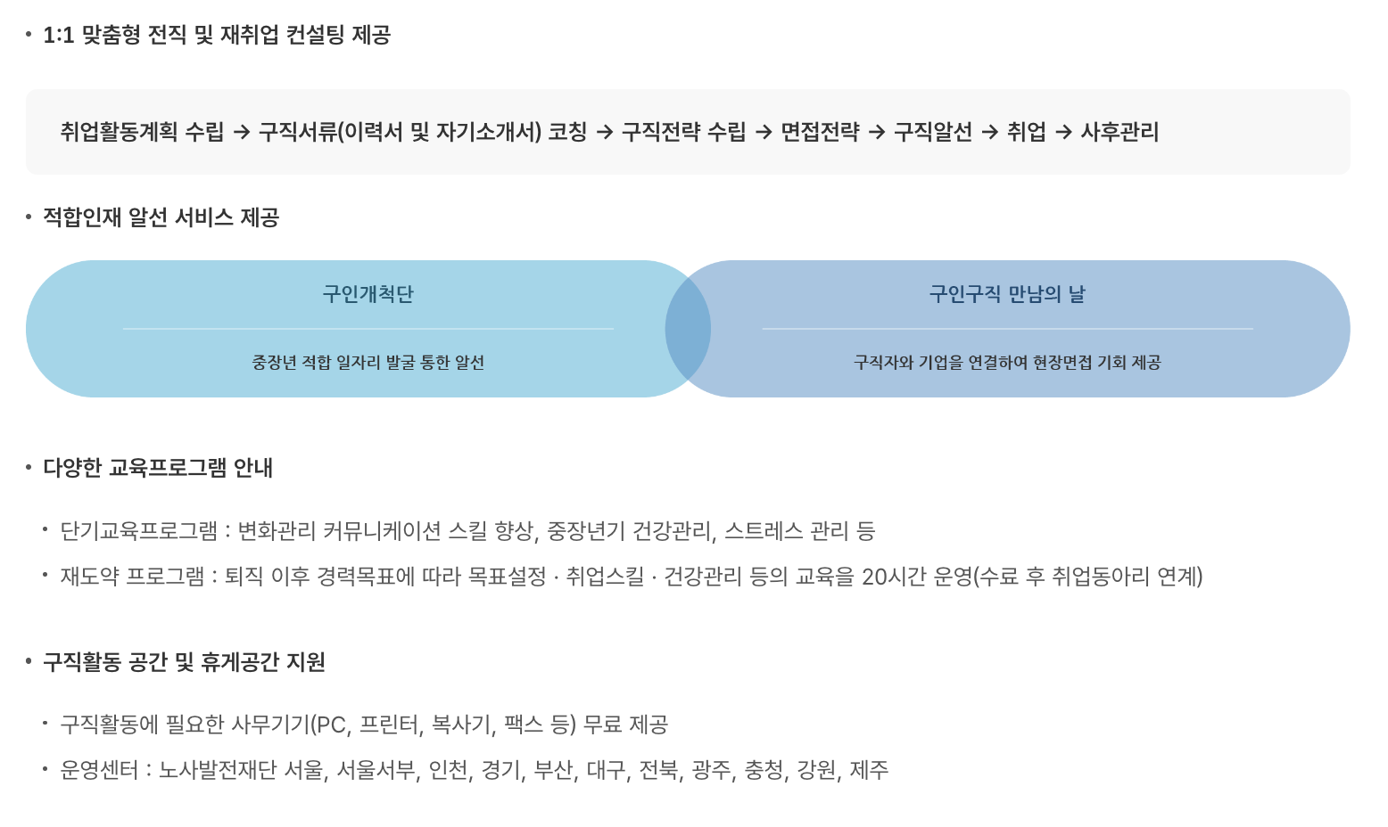 - 직업 상담 및 진로 설계 : 전문 상담사와의 상담을 통해 개인의 경력과 적성에 맞는 직업을 찾을 수 있도록 도와줍니다.