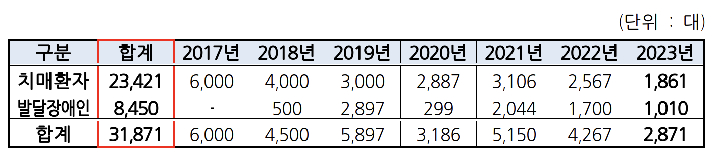 2017년부터 2023년까지 치매환자와 발달장애인 대상으로 31,871대의 배회감지기를 보급하였으며, 이를 활용한 실종자 발견사례가 2,232건에 이른다고 한다.