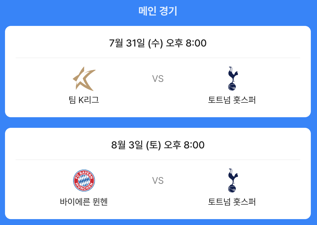 쿠팡플레이 시리즈 경기일정 ( 뮌헨, 토트넘, 팀K 리그)
