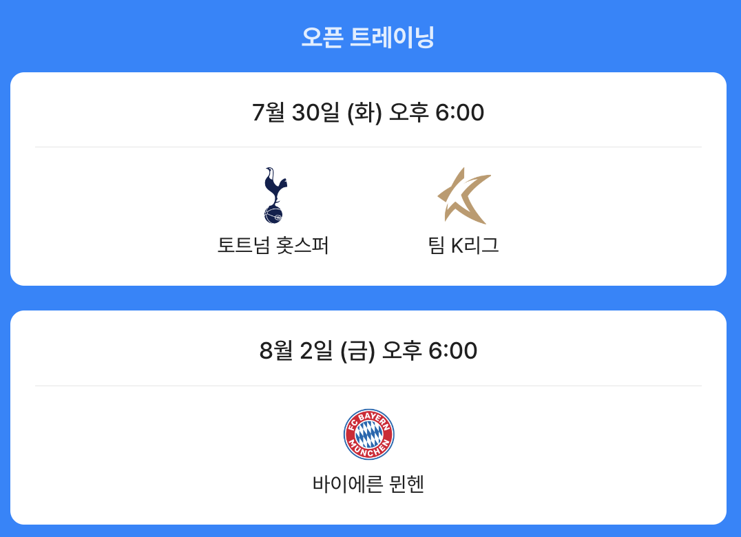 손흥민 소속의 토트넘은 7월 31일 팀K리그와 1차전을 김민재 소속의 뮌헨과 팀K리그는 8월3일 2차전을 펼치게 됩니다.