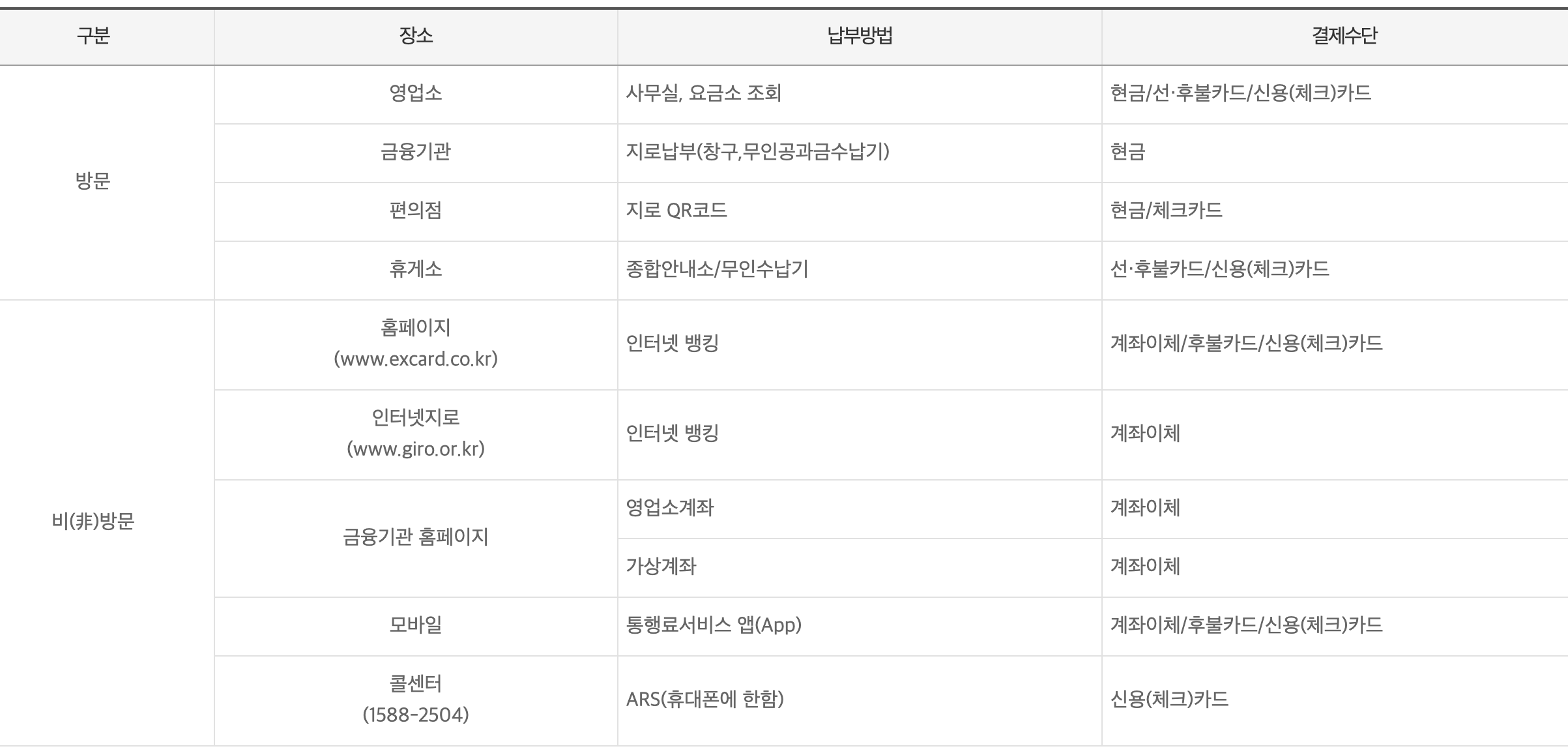 요금소에 직접 납부,홈페이지 납부, 편한 장소에서 편하게 스마트폰으로 납부하는 방법도 있으니 참고하시길 바라며 오늘 정보를 통해 고속도로 하이패스를 이용하는 모든 분들의 안전한 고속도록 운행되시길 바라겠습니다.