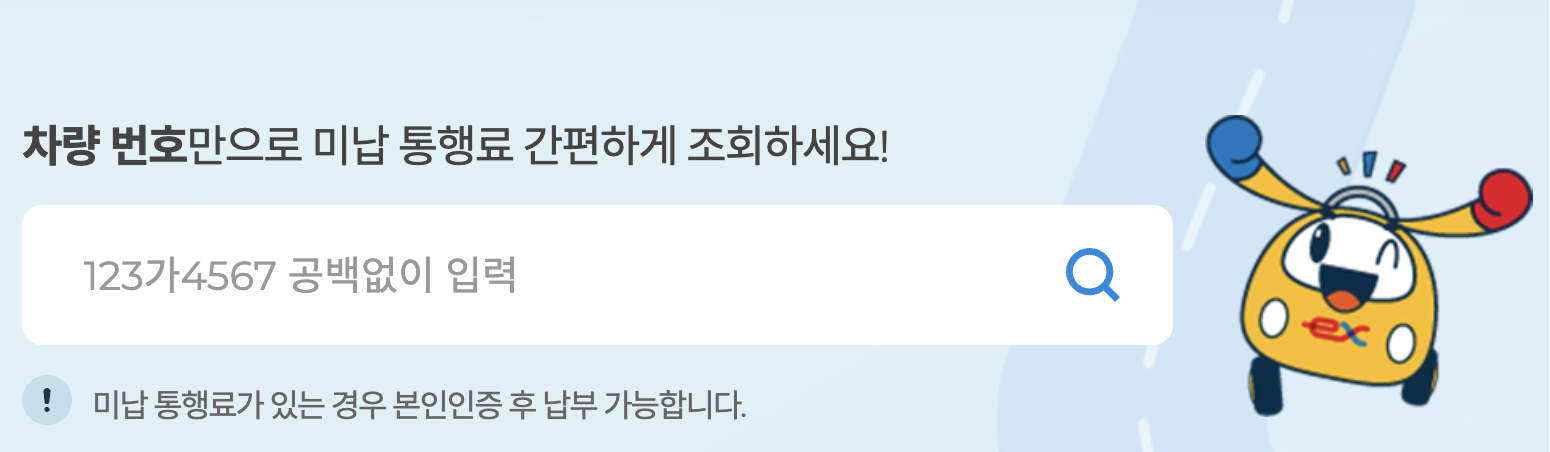 - 미납통행료는 미납발생일부터 최대 1일 이후부터 조회 및 납부가 가능합니다.