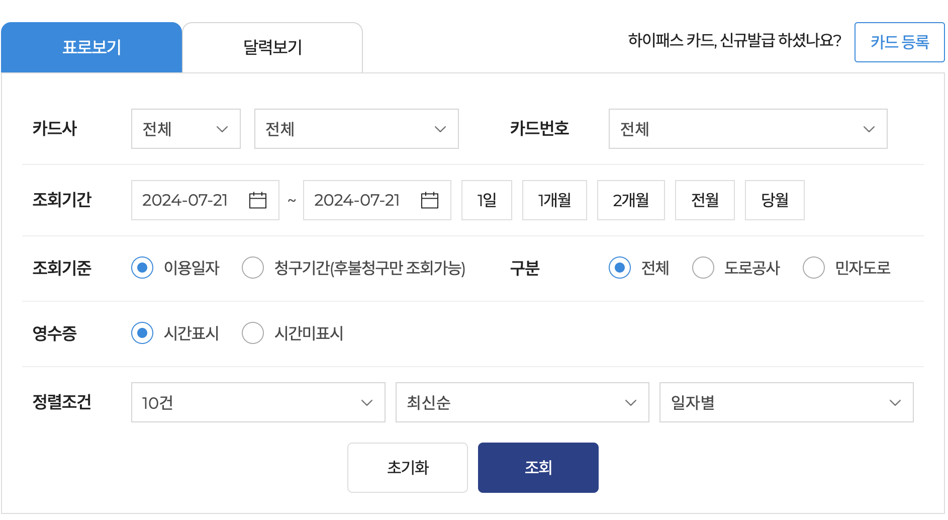 - 카드 등록 후 하이패스 사용내역 조회가 가능하며, 카드등록 안내를 참고하시기 바랍니다.