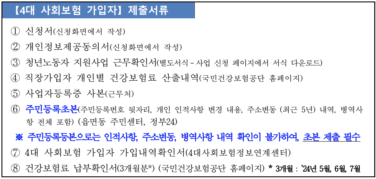 - 공공 마이데이터 활용에 동의한 경우 주민등록초본, 4대 사회보험 가입자 가입 내역확인서, 건강보험료 납부확인서 별도 제출없이 신청가능